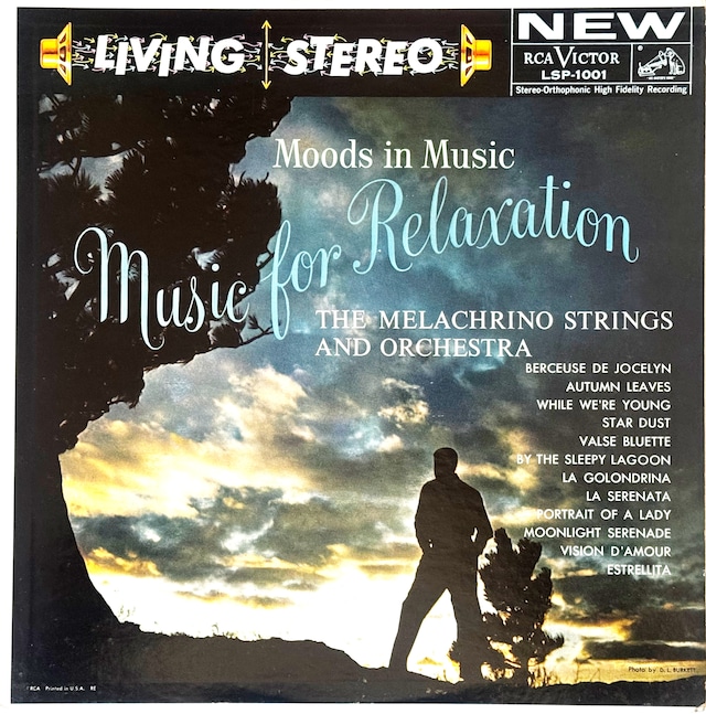 イギリス出身で、自らもヴァイオリン、ヴィオラ、オーボエ、クラリネット、サックスという楽器を操り、映画音楽やムード音楽のシーンで活躍した、ジョージ・メラクリーノとその楽団。ジャズやポップスを基調としつつイージーリスニングやムード音楽の粒ぞろいの作品を連発した彼ら。美しい旋律と優しいムードに包まれる爽やかな良盤です。1958年にMono盤とStereo盤とプレスされ、その中でLiving Stereoと銘打ってリリースされた同時期のリイシュー盤です。 Pop, Classical, Easy Listening, Mood USA 12inchレコード 33rpm Stereo RCA Victor LSP-1001 1958 ジャケ 4点/盤 2.5点 ジャケ裏汚れ 盤スレキズ B2冒頭に音に出るキズ ♫ )))) 試聴音源 ♫ )))) https://velvet-turnon.ssl-lolipop.jp/turnonsample/musicforrelaxationmelachrinostringsstereo1.mp3 https://velvet-turnon.ssl-lolipop.jp/turnonsample/musicforrelaxationmelachrinostringsstereo2.mp3 https://velvet-turnon.ssl-lolipop.jp/turnonsample/musicforrelaxationmelachrinostringsstereo3.mp3