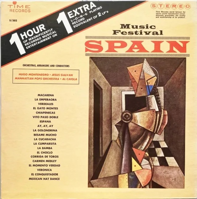 ステレオモノ、パーカッションモノ、というジャンルを確立したレーベル、タイムからの1枚。スペイン音楽のイメージは、燃えるような、もしくは、静かで暗く荘厳なといったあたりを想像する人も多いと思われます。スペインを題材に"La Bamba"や"Besame Mucho"、"La Cucaracha"など広く知られる楽曲を題材に、ウーゴ・モンテネグロ、アル・カイオラ、マンハッタン・ポップス・オーケストラらの演奏により、旅感高めでお届け。 Jazz, Pop, World, Easy Listening USA 12inchレコード 33rpm Stereo Time Records S/302 不明 ジャケ 2.5点/盤 4点 ジャケ汚れ底抜け 盤良好 オリジナルリリースは1966年Mono盤 ♫ )))) 試聴音源 ♫ )))) https://velvet-turnon.ssl-lolipop.jp/turnonsample/musicfestivalspain1.mp3 https://velvet-turnon.ssl-lolipop.jp/turnonsample/musicfestivalspain2.mp3 https://velvet-turnon.ssl-lolipop.jp/turnonsample/musicfestivalspain3.mp3