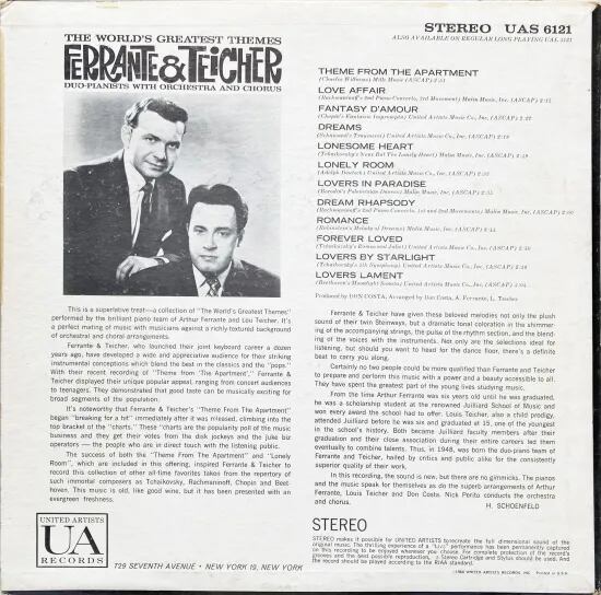 2人共に一級品の腕前を持ち、ジョン・ケージのプリペアド・ピアノを継承。実験精神とサービス精神を結晶化した興奮の作品や、イージー・リスニングや映画音楽の世界で名を轟かしたり、後年もしくは大量に出回っているコマーシャル音楽も多数手掛けたピアニスト、フェランテ&タイシャー。本盤では、60年以前に映画で使用されたクラシック曲多数収録。ニック・ペリトによるオーケストラとコーラスに、ブリリアントと思える音が際立ちます。プロデュースとアレンジは、ドン・コスタ。