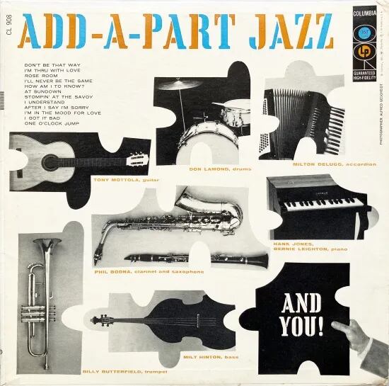 ジャズ・アコーディオン奏者、アレンジャー、コンダクターとして、レコード作品数は多くはありませんが、ラジオやTVショウなどの音楽監督として活躍した、ミルトン・デラグ。バディ・ホリー"Rave On"のプロデュースも彼。"Add-A-Part Jazz"とした本盤は、トニー・モトラ(g)、ミルト・ヒントン(b)、ハンク・ジョーンズ(ds)らと共に聴き手も演奏者として参加できる1枚。冒頭には、音程を合わせる音が入っており、譜面も付いてます。小粋な演奏を聴くも良し、演奏するも良しな楽しく内容も良いレコード。