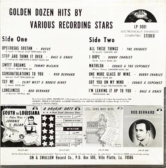 米・ルイジアナ州南西部でフランス語を話すクレオール系らの中から生まれ出た音楽シーン、ケイジャンやロックンロールの影響を受けたスワンプ・ポップなど多数のローカルミュージシャンのリリースを行った、JINのレーベルコンピ。"Golden Dozen"は、同レーベルでのヒット曲を集めたシリーズコンピでその第1弾です。代表的なところで、クッキー・アンド・ザ・カップケイクス、デイル&グレイス、ボビー・チャールズも入ってます。漏れ出す雰囲気、演奏最高。