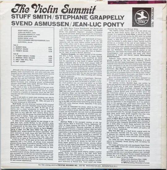 1966年9月30日にスイスで開催された「バイオリン・サミット」の模様をレコーディングした1枚。ジャズ・バイオリニストの系譜で外すことの出来ないメンツより選ばれた4名、アメリカのスタッフ・スミス、フランスのステファン・グラッペリ、デンマークのスヴェンド・アズムッセン、そして若い世代からジャン-リュック・ポンティ。バックも含め、楽しく充実の演奏がたっぷり。