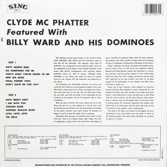 ニューヨークのブロードウェイでボーカル指導やアレンジャーで活躍した、ビリー・ワード。その彼と共に活動したビリー・ワード&ザ・ドミノズ。そこへにR&B、ソウルシンガーの中でも最高峰と言われる活躍が知られる、クライド・マクファターが参加した時期。米Federalよりシングルリリースをした"Do Something For Me"やノベルティー・ソング"Sixty Minute Man"が大ヒット。その当時の音源を纏め上げた1957年Kingからのベスト盤とも言える1枚。 ※デンマークSingからのリイシュー盤です。