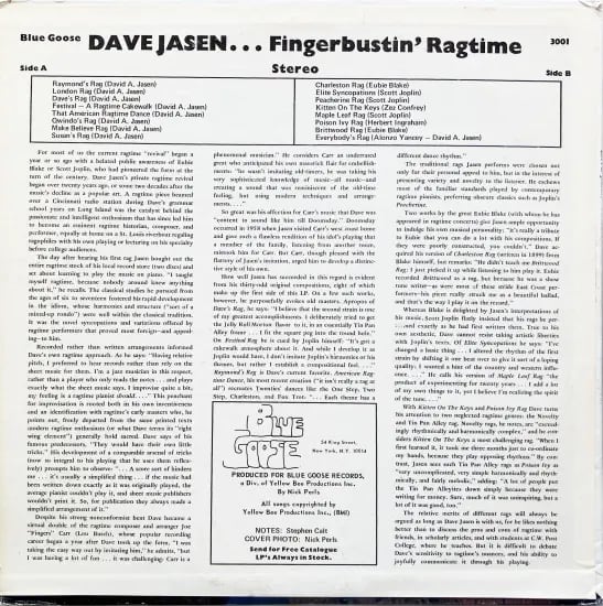 米Yazoo Records内のサブレーベルBlue Gooseからの1枚。数多のカントリー・ブルースや戦前ジャズの研究家兼ミュージシャンの魔窟とも言える同レーベルで、自らもピアノ演奏しラグタイムピアノ研究の第一人者はこのデイブ・ジェイセン。Side Aは全曲自作、裏はスコット・ジャプリン、ハーバート・イングラム、ユービー・ブレイクなどのジャズやポップス、ラグタイムのシーンで活躍した演奏家らの曲を取り上げて、ラストはジミー・ヤンシーの兄アロンゾの楽曲収録。超絶テクと愛溢れる演奏、素晴らしいです。この次作は日本でCD化されていますが、こちらはレコードのみ。ライナーノーツは、ステファン・カルト。プロデュースとジャケット写真をニック・パールス。