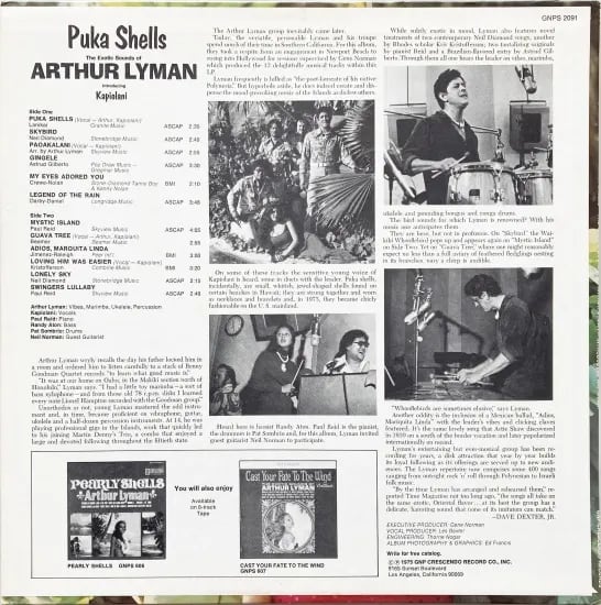ジャズ・ヴィブラフォン、マリンバなどの打楽器奏者として、ハワイを拠点に活動。ジャズとハワイアンを混ぜ生まれる洗練されたサウンドは「ラウンジミュージックの王様」とも称された、アーサー・ライマン。興行で米西海岸滞在中の1975年にジーン・ノーマンの呼びかけからハリウッド録音、GNP Crescendoリリースの1枚。ゲスト・ギタリストでニール・ノーマン参加。ボーカルはライマンと娘カピオラニ。ニール・ダイアモンド、クリス・クリストファーソンや、アストラッド・ジルベルトの楽曲を交え他作に比べポップス感多めで、たっぷりの南国感と涼やかな印象が広がる良盤。