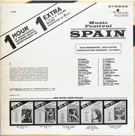 ステレオモノ、パーカッションモノ、というジャンルを確立したレーベル、タイムからの1枚。スペイン音楽のイメージは、燃えるような、もしくは、静かで暗く荘厳なといったあたりを想像する人も多いと思われます。スペインを題材に"La Bamba"や"Besame Mucho"、"La Cucaracha"など広く知られる楽曲を題材に、ウーゴ・モンテネグロ、アル・カイオラ、マンハッタン・ポップス・オーケストラらの演奏により、旅感高めでお届け。