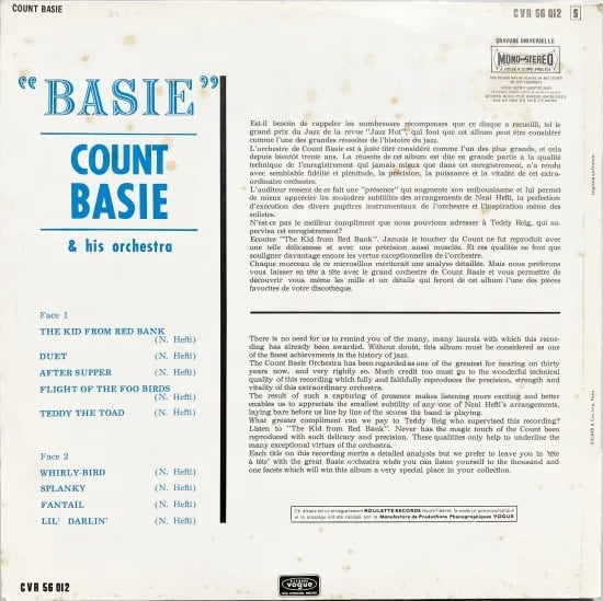 カウント・ベイシー率いる楽団が、1952年よりリリースをしたクレフを離れルーレットへ。その第1作目が強烈なジャケも目を引く本盤。楽曲はすべてニール・ヘフティ作。それまでにも絡みのあった両者ががっつりと真新しいベイシー楽団を提示した大傑作。メロディの美しさ、ソロイストの要所を彩る素晴らしさ。リズム隊も含めどれもが最上な仕上がりに驚く代表作。楽しく、ダイナミック、そして美しさもある1957年ニューヨーク録音。