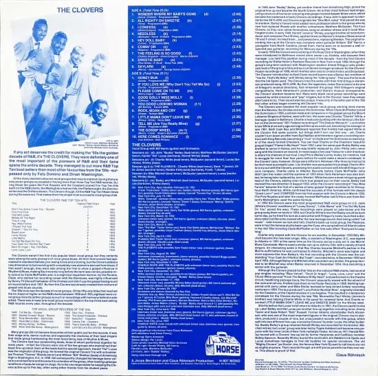 米ワシントンDCの高校生らによって1946年に結成された、ザ・クローヴァーズ。ドゥ・ワップ界隈、R&B史的にも最重要グループのひとつ。リーバー&ストーラーの提供曲"Love Potion No.9"の大ヒットも知られます。51年からの10年間の変遷を辿る良選曲で、ドミノズに在籍していたチャーリー・ホワイトが在籍した期間の録音物も含む嬉しい1枚。ブルージーなドゥワップの魅力満載、珍しい録音も有り。本盤は、1950年代中頃の楽曲を中心に収録したスウェーデンのジャズやブルースなどを紹介したMr R&B Records内レーベル"Dr. Horse"からの1枚。