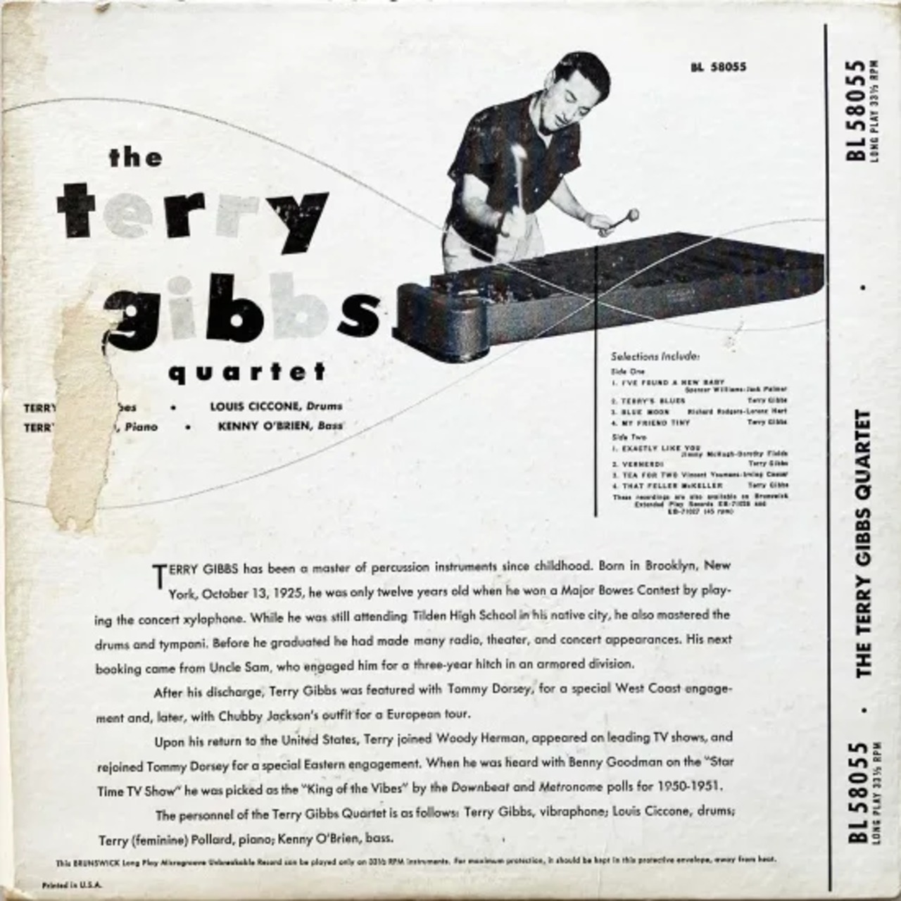 米ジャズのヴィブラフォン奏者として、トミー・ドーシー、バディ・リッチ、ウディ・ハーマン、ベニー・グッドマン、他との共演多数なテリー・ギブス。本盤は、カルテット名義のリーダー作としてリリースした恐らく最初の作品です。1953年にBrunswickよりVol.1、Vol.2として7インチ盤だったものを翌54年に10インチ片面ずつにまとめ収録したアルバム作品。自身もヴィブラフォンを奏で、彼の初期作に欠かすことの出来ない女性ピアニストのテリー・ポラード、他メンツも固定のバンドメンバーによって録音。