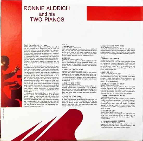 イギリスのピアニスト兼コンポーザーとして活躍、複数のジャズやポップス、イージーリスニング作品をリリースした、ロニー・アルドリッチ。ステレオ録音技術の躍進もあり、スピーカーの片方ずつにピアノを配置。多種多様な楽器を配し、リストやドビュッシー、ショパン、ほかポピュラーソングを題材に巧みなアレンジを加えています。味わいと深みある音が素晴らしい作品です。こちらは、彼のセカンドアルバムです。