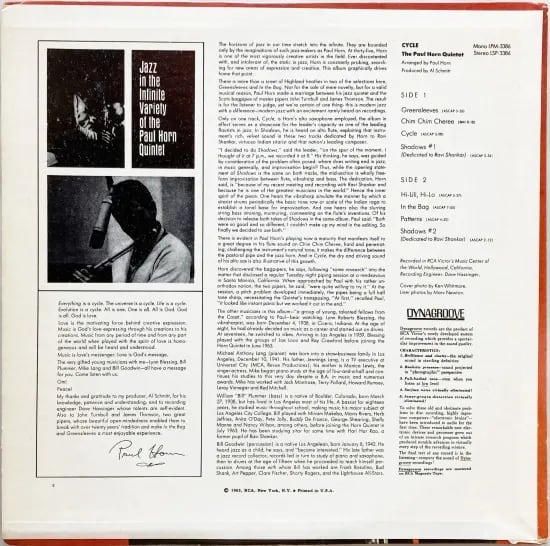 C・ハミルトン楽団で活躍し、素晴らしい録音を多く残し、ソロ名義を出して以降、活動や方向性が気になるポール・ホーン。多岐に渡る活動はまさに変幻自在。一貫したプレイと思想を武器に実に知的な音を生み出しました。クールでモードなジャズ〜イージーリスニングやソフトロック〜神秘&東洋思想への傾倒〜インドから世界へと軽々と音も心も垣根を越えた彼。このクインテット名義では4作目の本盤は、これまたオモシロい趣が散りばめられてます。曲、演奏の良さ、耳馴染みと良い訳ですが、実験的な”Gleensleeves”と”In The Bag”のモーダルムードへバグ・パイプの演奏を混ぜた2曲は、エキサイティングかつ希有さに驚き!”Hi-Lili, Hi-Lo”なんて良曲も◎
