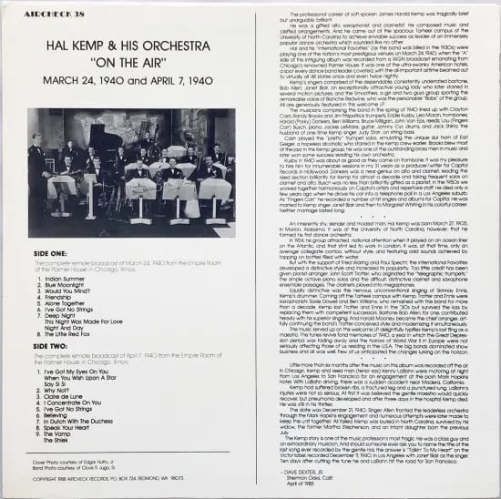 米アラバマ州マリオン生まれ、1924年ノースカロライナ大学在学中にダンスオーケストラを結成し徐々に表舞台へと登場した、サックス奏者、クラリネット奏者、作曲家、アレンジャーとして活躍したハル・ケンプ。SideAを1940年3月24日、SideBを同年4月7日にシカゴのパルマーハウスでの演奏を全米でラジオ放送した際の音源を収録した1枚。1940年春頃の所属メンバーとともに、充実の演奏、魅力溢れるボーカルたち、それぞれの音のアレンジに独創性を感じる素晴らしさ。タイトル通り"ON THE AIR"、こうした音源のリリースに特化したAircheckより。当時を窺い知れる嬉しいレコード。