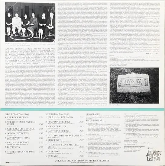 米オハイオ州出身のジャンプ・ブルース・シンガー兼ドラマー、タイニー・ブラッドショウ。ヤードバーズがカバーした”The Train Kept A’Rolin’”がよく知られています。ジャンプ・ブルースのクラシック曲を多数生んだ彼。その魅力を伝える華やかさと軽快さたっぷり。そこに様々な試みが新鮮さをもたらし、聴くほど味が出ます。スウェーデンのMr R&B RecordsのサブレーベルJukebox Lilからの編集盤で、1944年から1954年の楽曲で構成された全17曲収録。