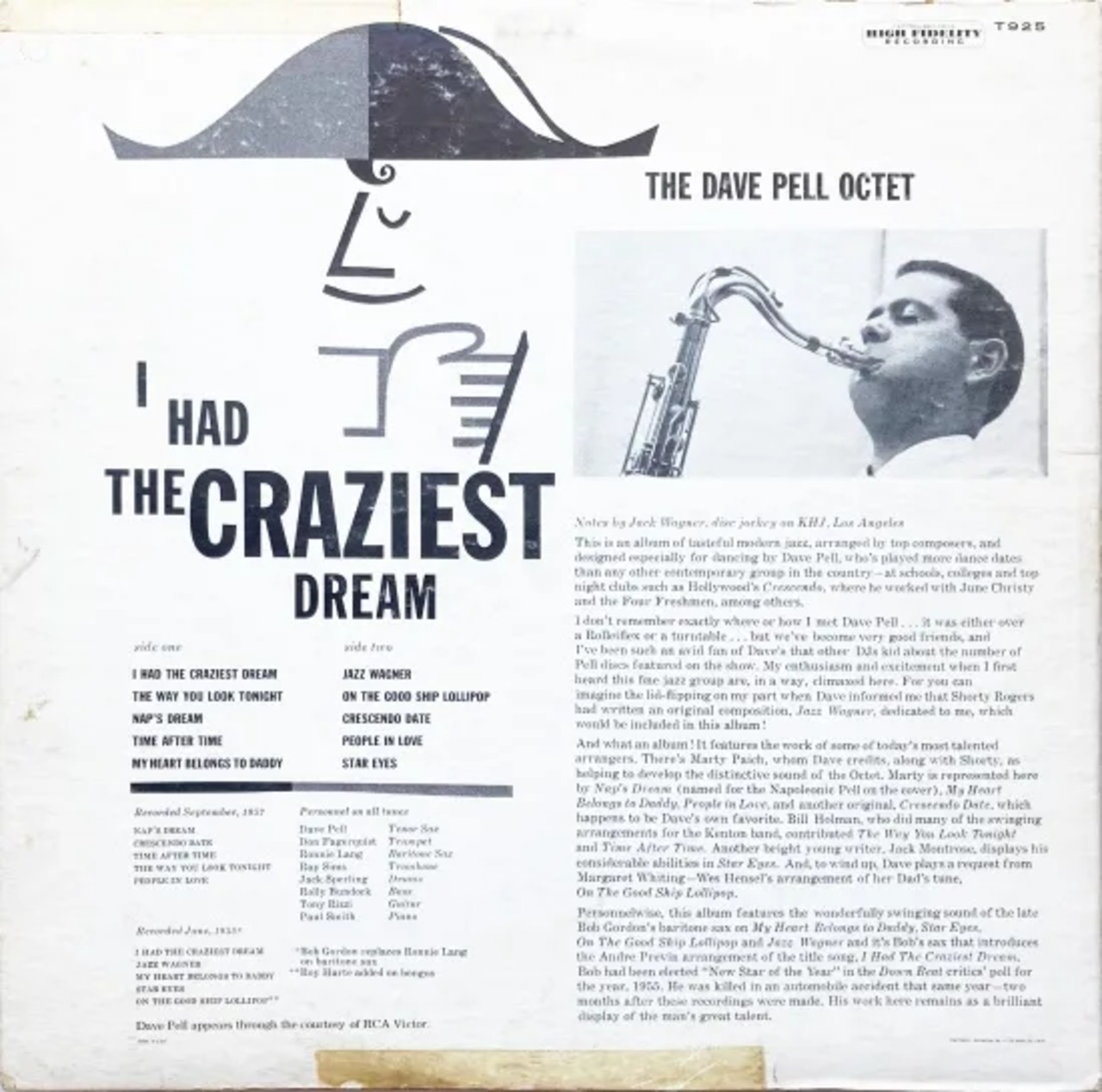 米ニューヨーク出身で1940年代に西海岸へ拠点を移し活動を本格化、レス・ブラウン楽団で活躍しサックス奏者ほかアレンジャーやプロデューサーとして、数々の作品を残すデイヴ・ペル。1953年よりオクテットとして活動、リリースを行っていた頃の1957年作。楽曲により53年と57年の録音が順不同に並んでいます。通して演奏アレンジ良くポップな聴き心地で、小粋なモダンジャズを展開。オクテット自体のメンバーは流動的だったようでテナーをペル自身、トニー・リジー(g)、ポール・スミス(p)、ジャック・スパーリング(ds)らが参加したキャピトルからの1枚。
