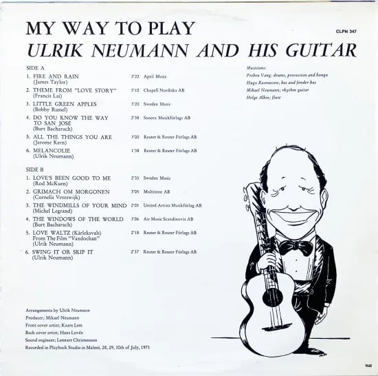 スウェーデンを代表するギタリスト、ウルリク・ノイマン。ジャズヴァイオンの名手、盟友スヴェンド・アズムッセンとの活動や、北欧を代表する女性シンガーのアリス・バブスとの活動が知られる彼。本盤は、地元レーベルCupolからの1971年作。ジャズ、スパニッシュ、ブラジル、クラシカルなスタイルは実に多彩。JT、バカラック、ルグラン他のポップ、イージーリス二ング、サントラ曲を鮮烈に時に静かに。オリジナル3曲収録。通して素晴らしい演奏で、たっぷりな魅力に嬉しい1枚です。