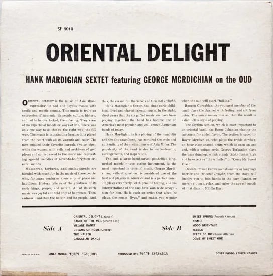マンドリンとアルトサックスを演奏するハンク・マーディガンを中心に、アルメニアの打楽器Dumbegを2種配備し、ほかはカスタネットとクラリネット、弦楽器ウードをジョージ・ムグルディチアンの編成。独特とも神秘的とも思えるエキゾティシズムをまとった魅力的な楽曲が緩急自在な演奏によりうねります。言葉の壁を軽々と乗り越える、中近東スタンダード。ロックンロールやジャズ感を抜いたガニムズ・アジア・マイナーズとも言い切れる、アルメニアン・アメリカンカルチャーを伝える1枚。 ※盤質によるプチプチノイズ有