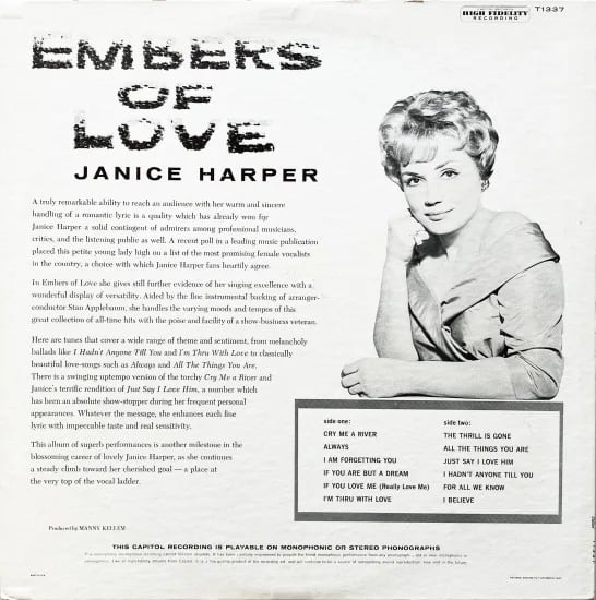ジャズやポップスを主として、クラブ・シンガーとして活動したジャニス・ハーパー。1950年代末から60年代半ばにシングル盤を中心にリリースを行い、恐らくアルバムリリースは米キャピトルからの2枚のみ。こちらはその2枚目です。スタンダード楽曲を、伸びやかな歌声がとても良いです。個性としての表現の良さをじっくり感じられるバラード曲も素敵です。