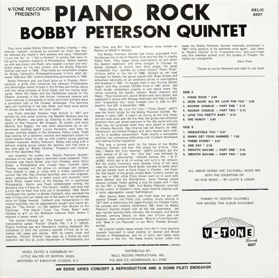 米ペンシルヴァニア州出身で、ピアニストやバンドリーダー、ヴォーカルとしてR&Bシーンで活動したボビー・ピーターソン。本盤タイトルの"Piano Rock"がヒット。また、のちにボビー・ダーリンがカバーしたルーサー・ディクソン作曲の"Irresistible You"は彼らの楽曲です。1959年に結成したクインテットと共に、レイ・チャールズから影響を受けたスタイル、バンドの強烈な演奏が魅力的。活動期にリリースした音源をほぼ収録した好内容編集盤。