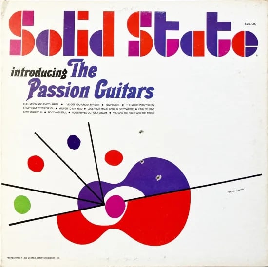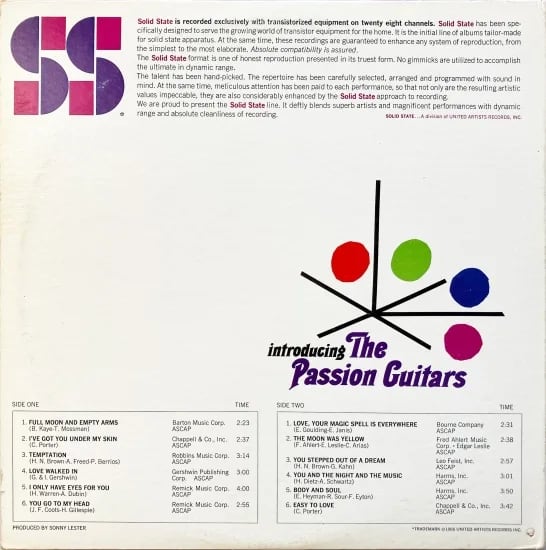 プロデューサーのソニー・レスターとフィル・ラモーン、アレンジャーのマニー・アルバムがUnited Artist Records傘下のレコードリリースレーベル、Solid Stete Recordsからの1枚。イノック・ライトのCommandやProject 3あたりを意識したような音とジャケットで、内容の発想地点は似ています。が、どれも楽しく個性的。本盤もまた、多様な音使いで刺激いっぱい。The Passion Guitarsのメンツは、ギターにバリー・ガルブレイスやバッキー・ピザレリなど、パーカッションには、テッド・ソマーとフィル・クラウスは全曲に参加。他、凄腕らが共演。