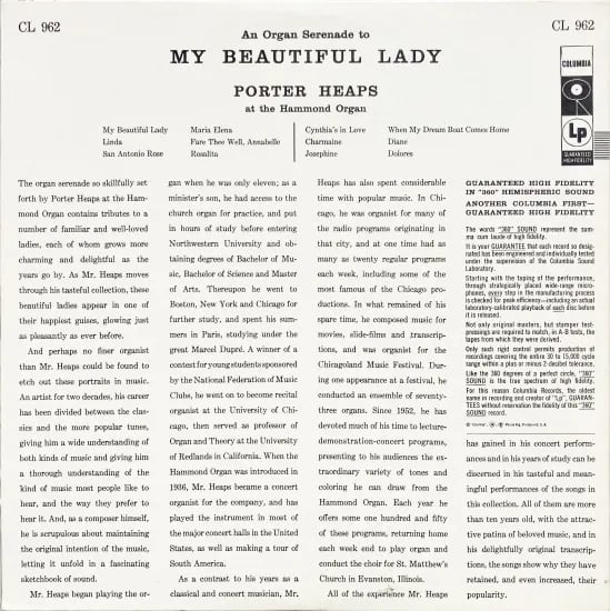米シカゴにあるハモンド・オルガン社が、同機を教会への販売だけでなく、ポピュラー音楽にも適用し販路拡大を目指し、宣伝すべく雇っていた人『ミスター・ハモンド』ことポーター・ヒープス。クラシックもポピュラーも弾ける彼が、本盤で取り上げているのは、女性をテーマにした楽曲で、実際に宣伝活動中も演奏していた楽曲がずらり12曲。小編成でゆったりとリラックスしつつ、巧みな演奏が嬉しい1枚です。