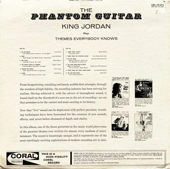 米Coralから1962年リリースの1枚で、タイトルからギタリストと思われるキング・ジョーダンの唯一作。ですが、詳細はまったくわからず。アンドレ・プレヴィンやトミー・ドーシー、ヘンリー・マンシーニ楽団では「ピーターガンのテーマ」などで演奏が聴けるギタリスト、ボブ・ベインがプロデュースとありますが、もしかしたら彼の変名かもしれません。内容は、ギターをメインにオルガンやサックスが華を添えるスモールコンボが心地良い演奏を広げるポップ・イージーリスニングな良盤です。