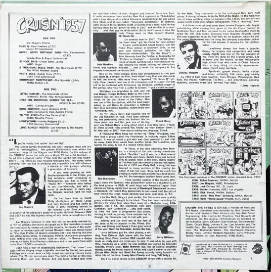 アメリカのロックンロールやポップスを大量にかけていたラジオの時代=ロックンロール・ヒストリーをレコードでという好シリーズ"Cruisin'"の1957年版。同時期に8枚1956から1962までリリースされています。本盤は、フィラデルフィアのラジオ局WDASで活躍し「ロッキンバード」の異名で知られるジョー・ナイアガラのディスクジョッキー・レディオ・ショウ。Dale Hawkins, The Tuneweavers, Chuck Berryなどが、ジングルや天気予報などと共に。良企画盤です。 ※Mono音源をStereoにしています。
