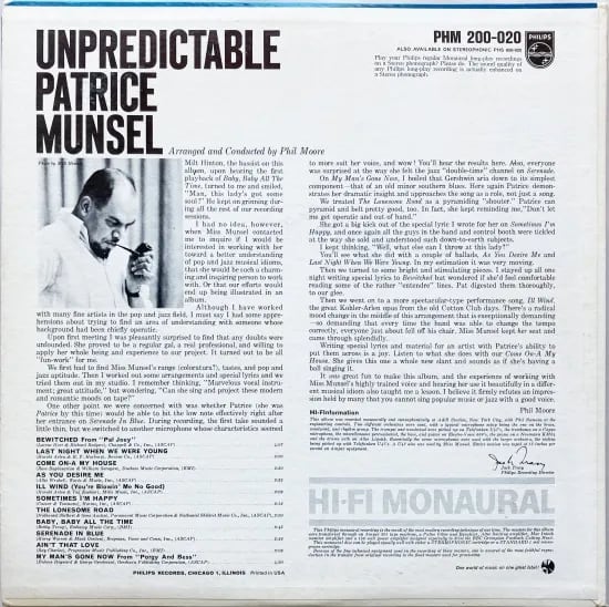 アメリカの女性ソプラノ歌手、パトリス・マンセル。その活動歴は、オペラ〜映画にテレビに舞台お芝居にと幅広くザ・芸能人と活躍。そんな彼女の唯一レコード作が本盤。彼女のオペラ面での作品は、生ものだけで録音は残されておらず。こちらは、ジャズ・ボーカル作品。作・編曲にフィル・ムーア。表現力が高いボーカルは、飽きのこない伸びやかさ。音もアレンジも妙技と思える最高さで彩り。軽妙さが心地良い”Bewitched”、粋な”Come On-A My House”や高速ラテンアレンジでスパークする”Ill Wind”、”Last Night When We Were Young”のしなやかさもと豊穣な音楽。