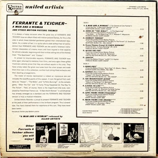 ふたり揃ってピアニストとして一級の腕前で、ジョン・ケージのプリペアド・ピアノを継承。実験精神とサービス精神を結晶化した作品、イージーリスニングや映画音楽の世界や、後年もしくは大量に出回っているコマーシャル音楽を手掛けたフェランテ&タイシャー。本盤ではタイトル曲にもなっているフランシス・レイの「男と女」で幕開けし、他も映画音楽のテーマとメインタイトルからチョイス。アレンジを本人らの他多数の面々が担当。どこまでも軽妙かつ優雅な彩りで心地良い良盤です。