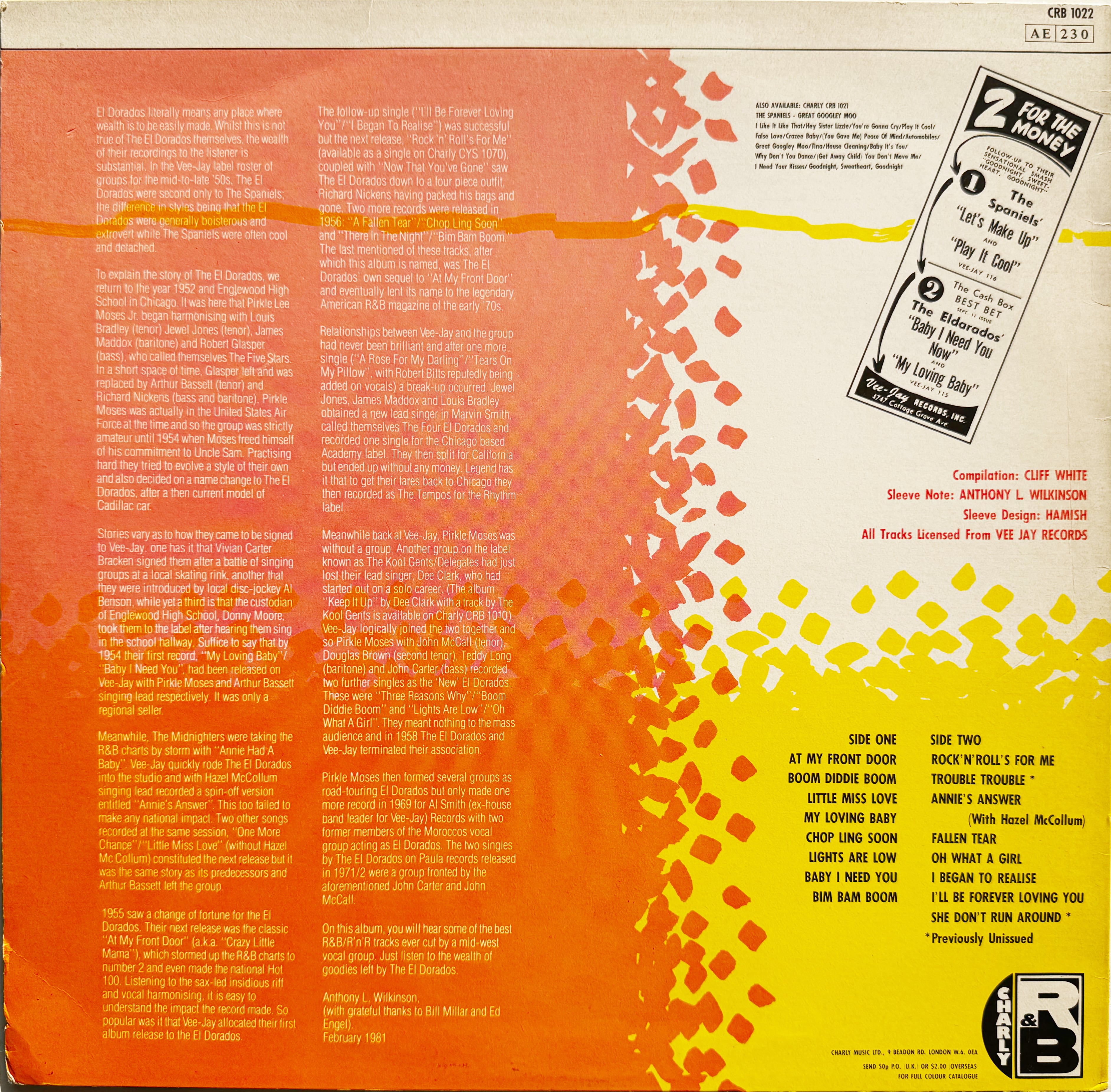 米シカゴ発で、地元イングルウッド高校の学生で組まれたリズム&ブルースボーカルグループ、エル・ドラドス。シカゴのドゥ・ワップシーンで活躍、メンバー構成を変えつつ、1993年リリースも。本盤は、イギリスのCharlyからの編集盤で、彼らの黄金期に音源を残したVee Jay Recordsの全面協力でリリースされました。ジャケットからも感じる、若さとフレッシュさ。勢いを感じるボーカルワークと。未発表音源も加えた嬉しい1枚になっています。