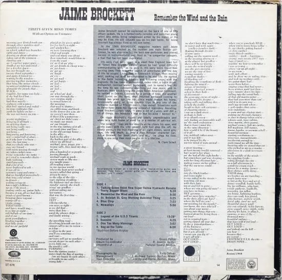 米・ボストンのシンガーソングライター、ジェイミー・ブロケット。フォーク、アシッド・フォークといった趣きの作品が多い彼のファースト。軽やかにつま弾かれるギターと軽やかな歌い回しと、ゆっくりした曲で発揮されるアシッドな印象。タイトル曲”Remember the Wind and the Rain(A2)”や”Nowaday(A5)”,”Suzzane(B2)”など、素晴らしく滋味溢れた歌声が堪能出来ます。またクリス・スマイザーとの共作”Legend of the U.S.S Titanic”も強烈。ダルシマーを弾く”St. Botolph St. Grey Morning Dulcimer Thing”など。たっぷりな充実の1枚です。