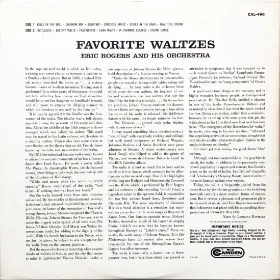イギリス出身で、テレビ番組や映画音楽の世界で作曲家、アレンジャー、コンダクターとして活躍したエリック・ロジャース。本盤は、1959年にリリースされた1枚で彼の指揮によりワルツ曲を演奏した音源を収録。リロイ・アンダーソンやロジャース&ハマースタインなどの楽曲を色彩豊かで膨らみのある心地よい演奏に仕上げた、どこか安らぐ全12曲。