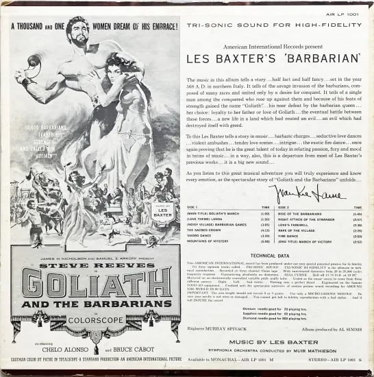 音楽的知識とセンス、好奇心を総動員して、本人の頭の中にある世界の音と音楽を具現化し続けた素晴らしいレコード体験を提供してくれた、レス・バクスター。1959年に制作されたイタリア映画で邦題を「鉄腕ゴライアス 蛮族の恐怖」に、アメリカ公開当時彼がスコアを手掛け制作されたサウンドトラックアルバム。宇宙に興味があるかと思えば、古代異郷にも興味あるバクスターの手腕、オーケストラで彩る音で映像が立ちのぼる良盤です。