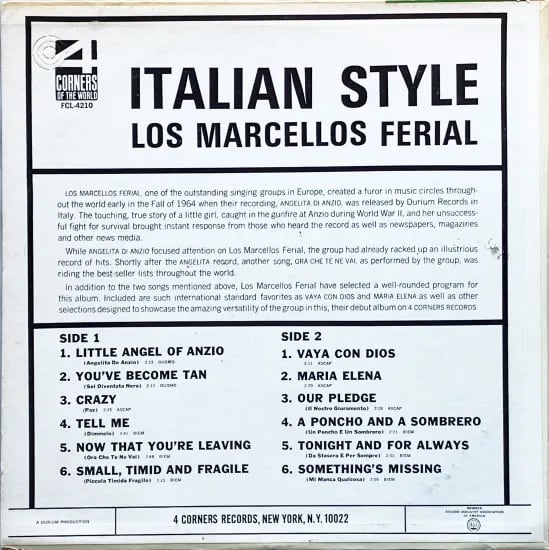 1960年代にイタリアで活躍し世界中で人気を得たボーカル・トリオ、ロス・マルセロス・フェリアル。第二次世界大戦で地元の銃撃戦に巻き込まれた少女アンティオの実話を盛り込んだ曲"Angelita De Anzio"(A1)を歌い大ヒット。その勢いのままに"Ora Che Te Ne Vai"(A5)も大ヒット。ほか、イタリアやラテン・アメリカ圏〜世界中で流行した楽曲を盛り込んでリリースした1stアルバム。歌も良いですし、どの曲もバンドの演奏がとても楽しいです。本盤は、イタリアの老舗レコードレーベル"Durium"からリリースされたアルバムを、曲名を英語表記にしてアメリカでリリースされた盤です。