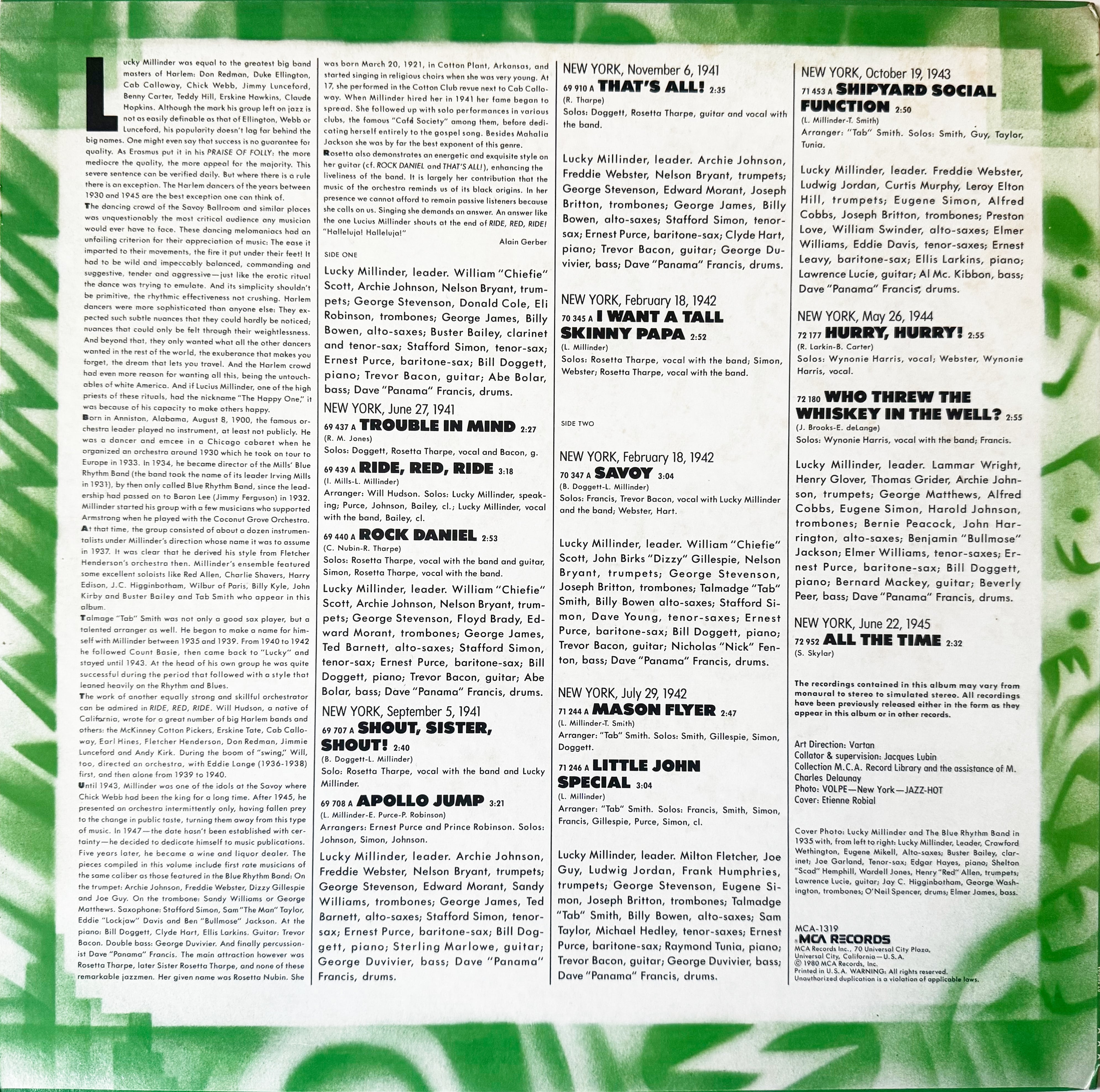米・MCAレコード、デッカが、残されていたアメリカとフランスのジャズシーンの音源を年代やスタイル、もしくはバンドに特化して編集を行い1980年から1983年までに、合計80枚リリースを行ったシリーズ"Jazz Heritage Series"の1枚。20年代から活動を通して様々な音楽を吸収、放出をつづけ時代を熱狂させた、ラッキー・ミリンダー楽団。その大充実期を収録したのが本盤。枚挙も大変なバンドメンバーに驚きますが、演奏がとにかく凄い。ここからR&Bの大潮流が生まれていったと言っても過言では無い、興奮の連続が次から次へで嬉しい。