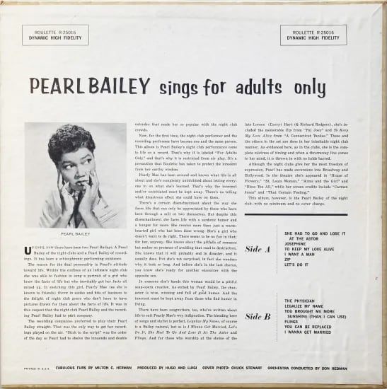 15歳からエンターテイメントの世界で活躍した女優、パール・ベイリー。ブロードウェイ、スクリーン、レコードリリースも多数。本盤は、いつものジャズやブルースをシンガーとして歌うポピュラーな存在でなく、それらの仕事と同時に彼女が立っているもうひとつの舞台「ナイトクラブ」でシンガー兼アクトレスとして振る舞っている様をと制作されたレコード。ナイトクラブに立つパール・ベイリーが自宅で聴けるよと、聴き手を選ぶという意味合いでの「アダルト・オンリー」ってことみたいです。演技同様にさまざまな歌い分け、バックバンドの演奏も冴えてます。好企画と思える粋を感じる1枚。