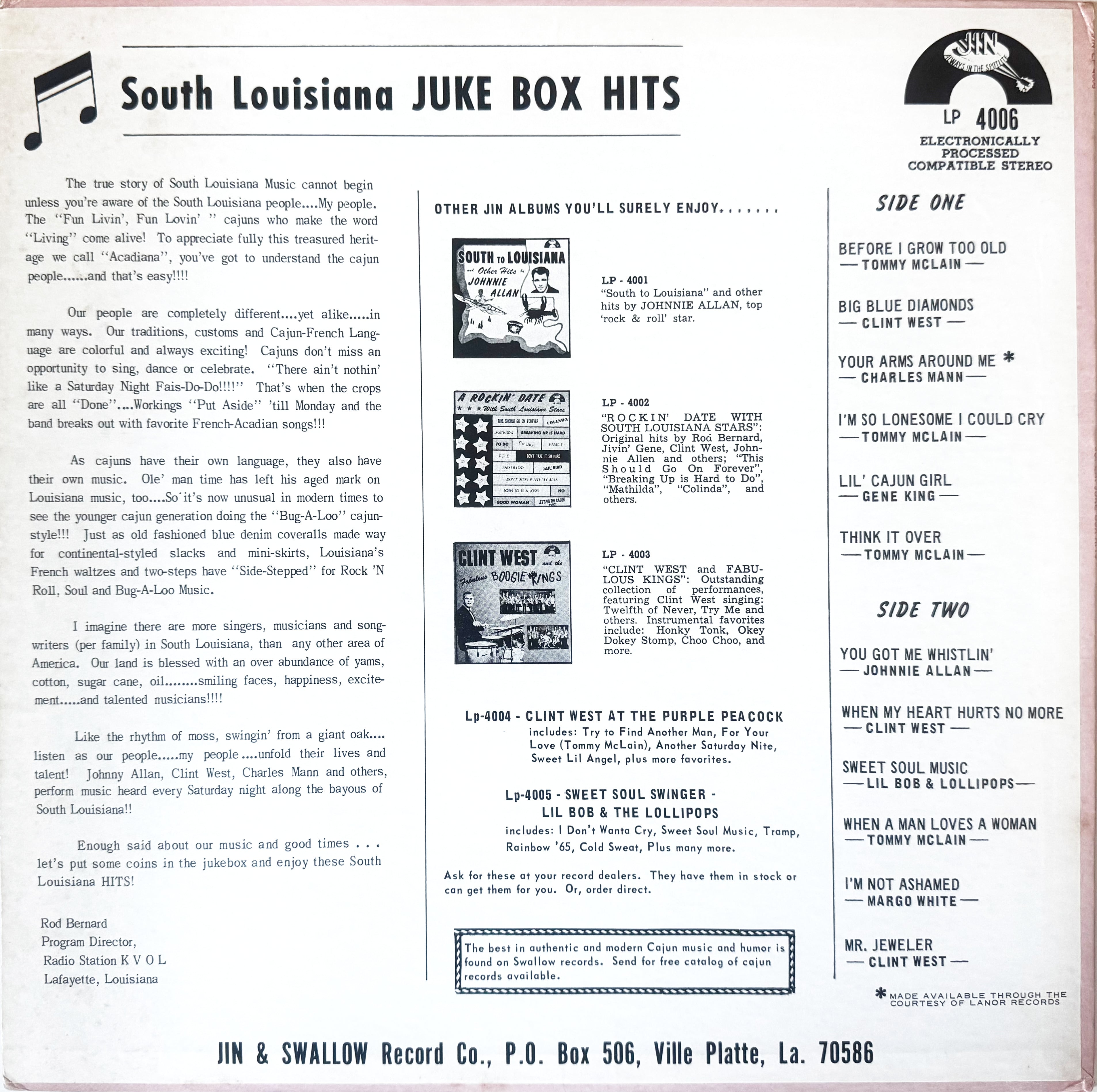 米・ルイジアナ州南西部でフランス語を話すクレオール系らの中から生まれ出た音楽シーン、ケイジャンやロックンロールの影響を受けたスワンプ・ポップなど多数のローカルミュージシャンのリリースを行った、JINのレーベルコンピ。本盤に収録されているのは、ルイジアナの酒焼け&荒々しさを感じるポップスというイメージよりも、オールディーズ、R&Bなどの路線を受けた楽曲中心の選曲でどれもが洗練された印象です。同レーベルからリリースもある大スター、ジョニー・アランも含め全12曲を収録。