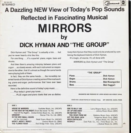 イノック・ライト主宰のコマンドから、プロデュースと録音コンセプトを打ち出して彼が手掛けたシリーズ。ポピュラー、ジャズ、イージーリスニング、アメリカ映画音楽などを題材に多岐に渡る活動で知られた鍵盤奏者、ディック・ハイマン。本盤は、ソウル・ジャズのレコードで目をすることも多いふたり、ベースにボブ・ハガード、ドラムにボブ・ローゼンガーデンを迎えた1枚。ディック・ハイマンのピアノとオルガンもそんな振れ幅で、ソロでも多重録音でも聴かせてくれます。グルーヴィーでヒップな演奏、小編成で色彩豊かなアレンジ、遊び心満載のエキサイティングな好盤。