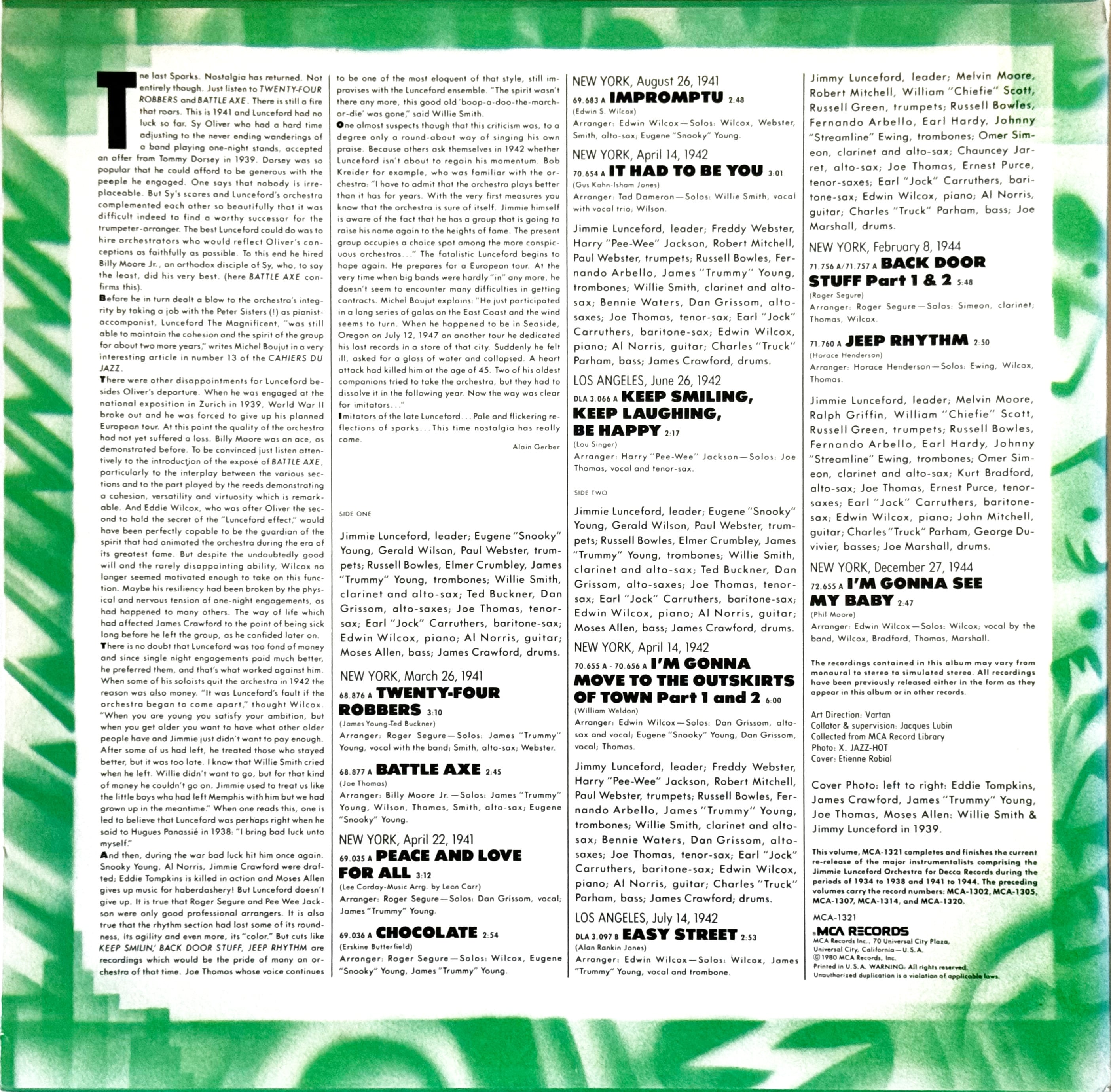 米・MCAレコード、デッカが、残されていたアメリカとフランスのジャズシーンの音源を年代やスタイル、もしくはバンドに特化して編集を行い1980年から1983年までに、合計80枚リリースを行ったシリーズ"Jazz Heritage Series"の1枚。ポール・ホワイトマンの父に師事し、アルトサックス奏者兼バンドリーダー、ジミー・ランスフォードの1941年から44年にスポット。本シリーズのラスト作。47年に他界するランスフォードの最後期を収録。ビバップ前夜のハードなスウィング・ジャズ、濃密かつ濃厚と思える魅力を発する様が曲ごとに感じられる充実音源です。