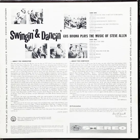 ビッグ・バンド・ジャズ隆盛期よりクラリネットをメインに、サックスやフルートなどでも録音物を多く残すガス・ビヴォナ。様々な楽団でも活躍しMGMと契約〜マーキュリー、ワーナーなどでスタジオセッションとソロ名義リリースの頃のレコード。彼の盟友となったコンポーザー、シンガー、コメディアン、ピアニストといった活動に加え、1954年より"The Tonight Show"の共同脚本と初代司会として一躍人気を獲得したスティーブ・アレンの楽曲を本人と共に取り上げた1枚。華やかな演奏は粋にスウィング、伸び伸びとしてドラマチックなハリウッド・ジャズに仕上げた良盤です。