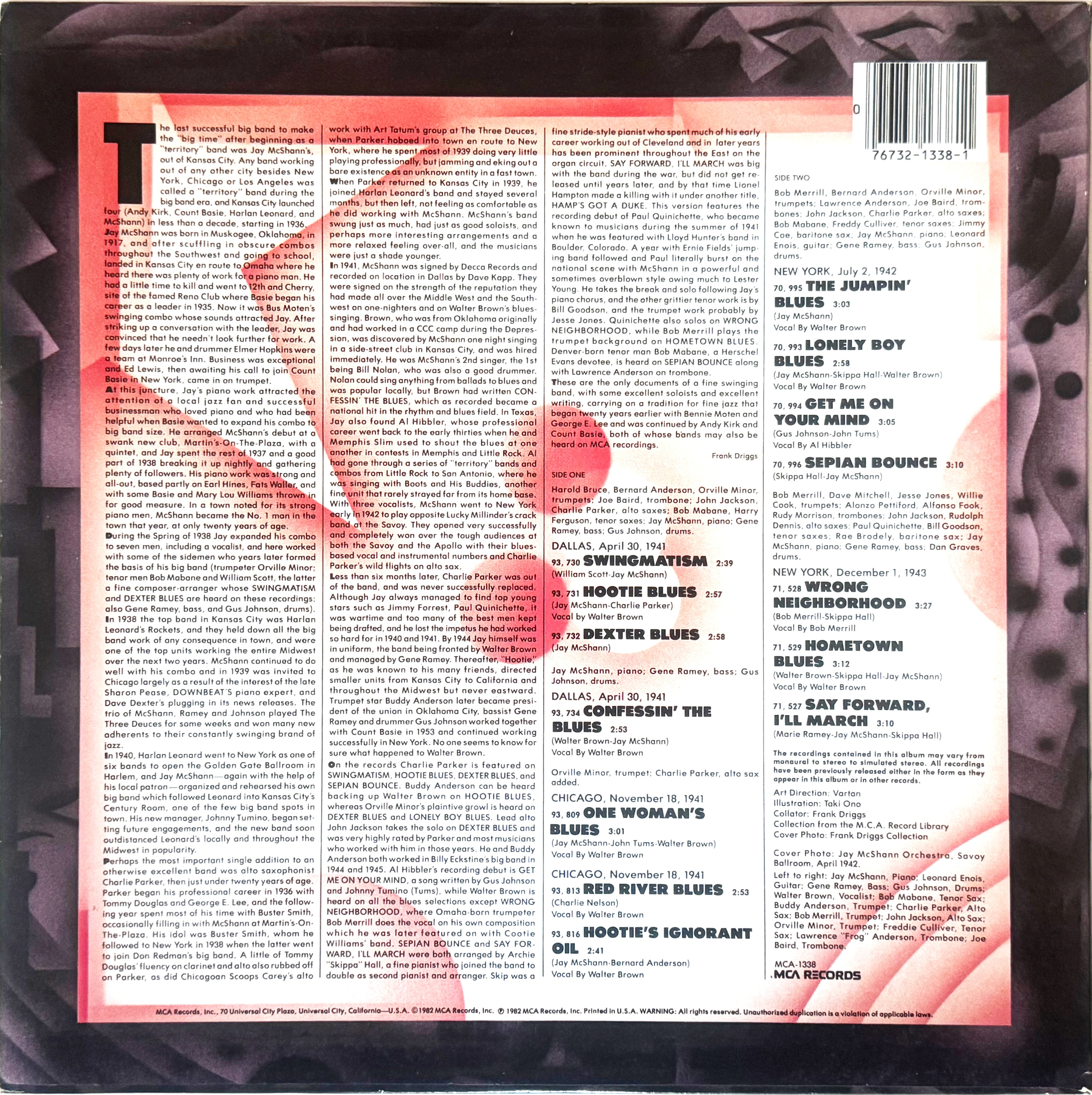 米・MCAレコード、デッカが、残されていたアメリカとフランスのジャズシーンの音源を年代やスタイル、もしくはバンドに特化して編集を行い1980年から1983年までに、合計80枚リリースを行ったシリーズ"Jazz Heritage Series"の1枚。幼少期より親に隠れて?独学で習得したピアニストのジェイ・マクシャン。カンザスへ移り、ビッグ・バンドスタイルで活動する中で出会った若き日のチャーリー・パーカーを見出します。その在籍期の録音を中心に収録。年代的に最初期ということではないですが、録音期が恐らく41年からとなる為と思われます。ミッドテンポもスウィングする楽曲も黒光りするようなジャズや歌を披露します。