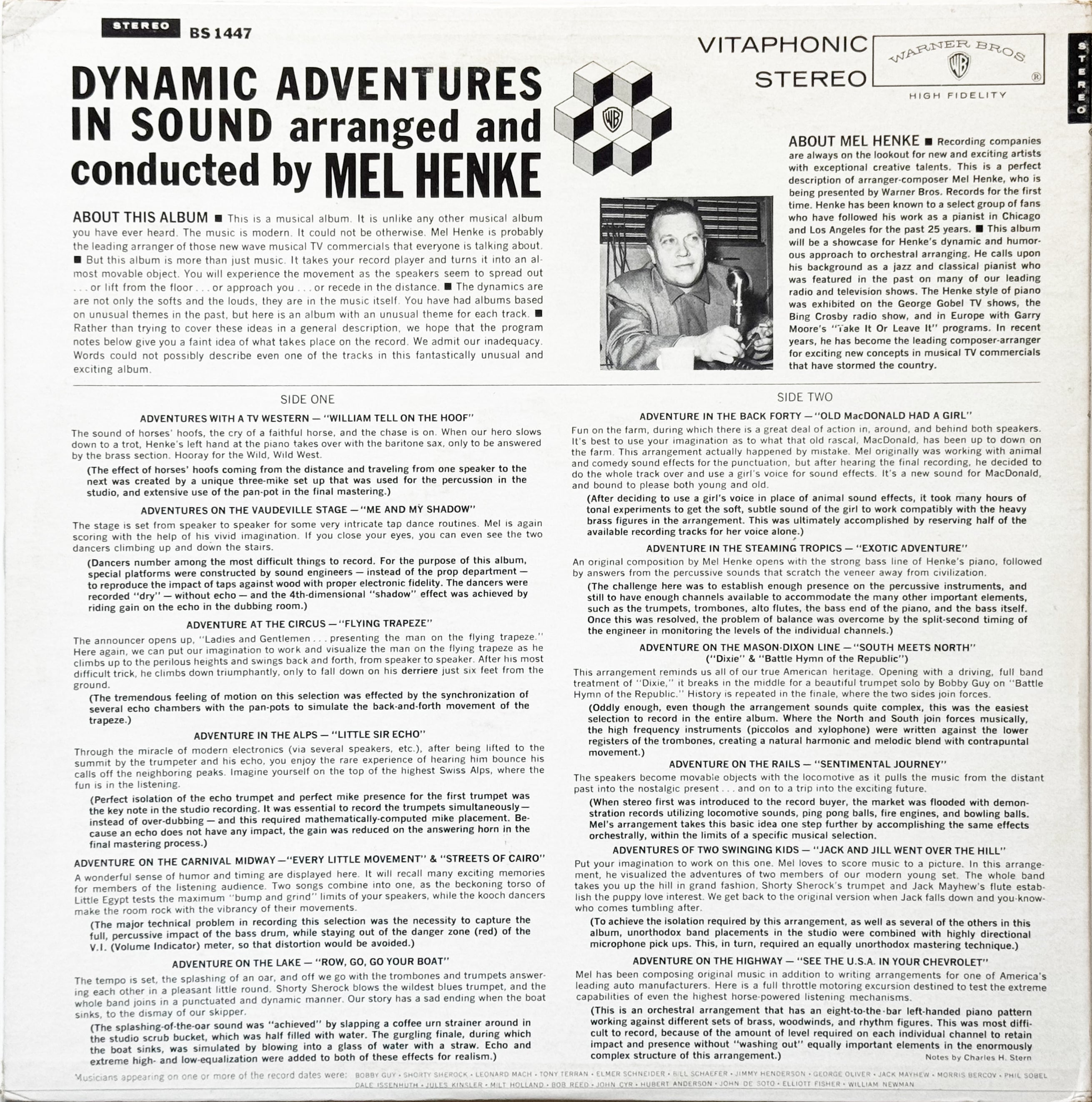 米シカゴ・イリノイ出身で、シカゴでバンドリーダーなど活躍したジャズ・ピアニスト、メル・ヘンク。本盤は、米ワーナーで"Stereo Workshop Series"と銘打ち1962年に数枚のリリースがなされたステレオレコーディング実践盤のメル・ヘンク編。自身の活動の1つでもあるミュージカル曲編曲アレンジの面を収めた1枚。ぜひスピーカーで鳴らして欲しい、斬新なアレンジとユーモア、飛び出す強烈な音はまさにエキサイティング、録音の妙技に刻まれた心躍る音楽集です。