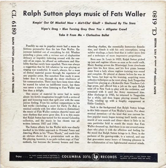 米ミズーリ州出身、ジャック・ティーガーデン楽団で活躍、その後ニューヨークのエディ・コンドンの元で名を知らしめたピアニスト、ラルフ・サットン。本盤は、米コロンビアの1950年代初頭にリリース展開したジャズ・ピアニストに焦点を当てた"Piano Moods"シリーズの次に取り組んだ1枚。敬愛するファッツ・ウォーラーの楽曲を取り上げ、彼に通じるオリエンタルさを感じさせる演奏。そこへ彼らしい軽やかさと自由なトーンが加わります。