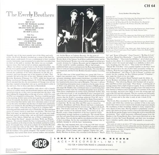 ビートルズ、ビーチ・ボーイズ、サイモン&ガーファンクルにも影響を与えた美しいハーモニーを武器に、1950年代米ロックンロール、ポップ・カントリーのシーンに現れたドン&フィル・エヴァリー兄弟のデュオ、ザ・エヴァリー・ブラザーズ。本盤は、初期リリースを行なっていた米Cadence音源の中から、R&B系楽曲を多めに英Ace選曲で全12曲収録。快作連発の良編集盤です。