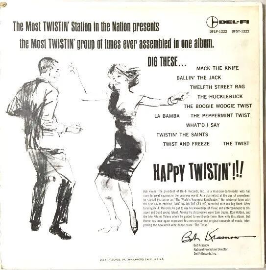 米ハリウッドに拠点をおいたレコードレーベル、デル・ファイ。1958年から2003年まで音楽ファンを魅了し続けたレーベルの主宰者、ボブ・キーン。サム・クックやリッチー・ヴァレンスを世に紹介し、ミュージシャンでもある彼。本作は、ツイストブーム真っ只中に会社を知って貰って売り上げを伸ばそうという発想から制作されたゴキゲンツイスト作。”Mac The Knife”に”The Peppremint Twist”に”La Bamba”だってとサービス過剰。プロモーションの意味を込めて、DJと各地のラジオ局を巻込む為、踊るDJの写真とタイトルラジオ局名を入れてます。本盤は、KRLA放送用。