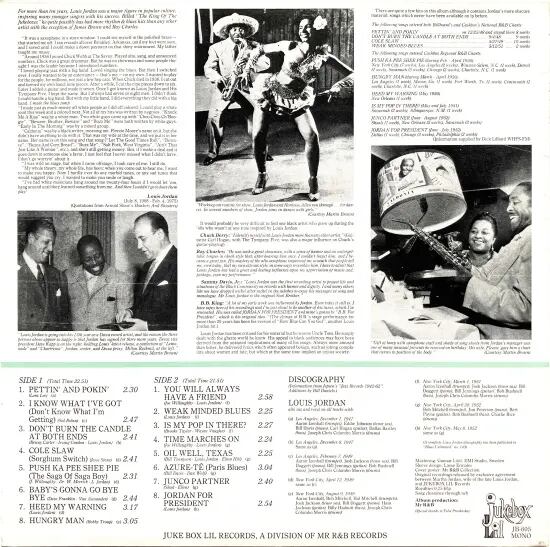 アメリカのサックス&ボーカリストとして活躍し、ヒットも飛ばしたジャンプ・ブルースの代表選手、ルイ・ジョーダン。彼が1930年代から70年まで活動したグループでの、黄金期とも思える1947から52年の録音物から16曲を収録。黒光りするような魅力溢れる演奏、素敵さと洒落た印象も含んだ好内容。スウェーデンのMr R&B RecordsのサブレーベルJukebox Lilからの編集盤です。