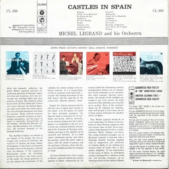 音楽一家に生まれ、作曲家、ピアニスト、映画監督や俳優もこなすミッシェル・ルグラン。1950年代からジャズや映画音楽の分野で大活躍。映画「シェルブールの雨傘」や「ロシュフォールの恋人」などの音楽を手掛けた彼。本盤以前に1955年”I Love Paris”、56年”Bonjour Paris”、58年”Week-End A Vienne”といった各都市を故郷に持つ、もしくは拠点に活動した演奏家や作曲家の作品を全編に取り上げた、イージーリスニング・シリーズ。旅情とダイナミックさが楽しいスペイン編。